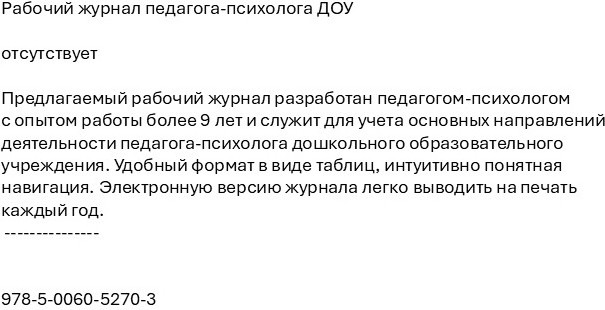 Рабочий журнал педагога-психолога ДОУВ данный момент этот товар отсутствует в продаже. Возможно, у нас найдется аналогичный или похожий товар здесь. Предлагаемый рабочий журнал разработан педагогом-психологом с опытом работы более 9 лет и служит для учета основных направлений деятельности педагога-психолога дошкольного образовательного учреждения. Удобный формат в виде таблиц, интуитивно понятная навигация. Электронную версию журнала легко выводить на печать каждый год. |