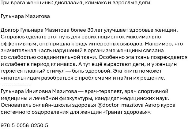 | Гульнара Иниловна Мазитова — врач-терапевт, врач спортивной медицины и лечебной физкультуры, кандидат медицинских наук. Основатель онлайн-школы здоровья. Автор курса системного оздоровления для женщин «Гранат здоровья». |