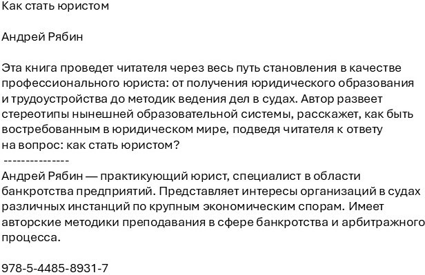 Как стать юристомВ данный момент этот товар отсутствует в продаже. Возможно, у нас найдется аналогичный или похожий товар здесь. Эта книга проведет читателя через весь путь становления в качестве профессионального юриста: от получения юридического образования и трудоустройства до ведения дел в судах. Автор развеет стереотипы нынешней образовательной системы, расскажет, как быть востребованным в юридическом мире, подведя читателя к ответу на вопрос: как стать юристом? |