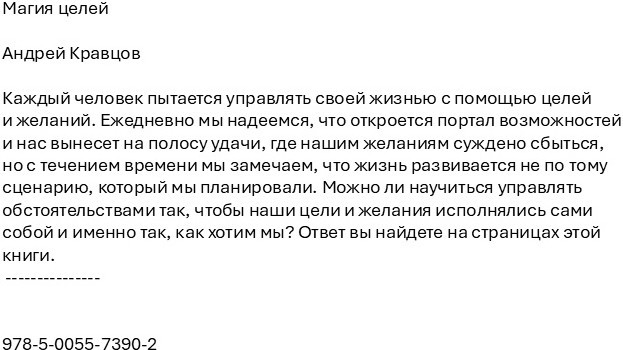 Магия целейВ данный момент этот товар отсутствует в продаже. Возможно, у нас найдется аналогичный или похожий товар здесь. Каждый человек пытается управлять своей жизнью с помощью целей и желаний. Ежедневно мы надеемся, что откроется портал возможностей и нас вынесет на полосу удачи, где нашим желаниям суждено сбыться, но с течением времени мы замечаем, что жизнь развивается не по тому сценарию, который мы планировали. Можно ли научиться управлять обстоятельствами так, чтобы наши цели и желания исполнялись сами собой и именно так, как хотим мы? Ответ вы найдете на страницах этой книги. |