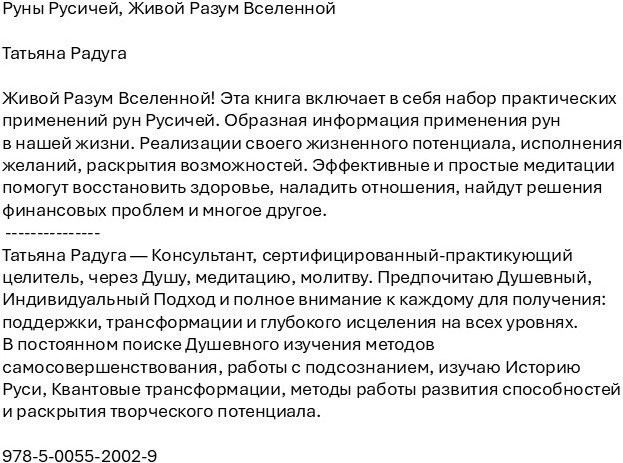 Руны Русичей. Живой Разум ВселеннойВ данный момент этот товар отсутствует в продаже. Возможно, у нас найдется аналогичный или похожий товар здесь. Живой Разум Вселенной! Эта книга включает в себя набор практических применений рун Русичей. Образная информация применения рун в нашей жизни. Реализации своего жизненного потенциала, исполнения желаний, раскрытия возможностей. Эффективные и простые медитации помогут восстановить здоровье, наладить отношения, найдут решения финансовых проблем и многое другое. |