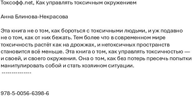 Токсофф.net. Как управлять токсичным окружениемВ данный момент этот товар отсутствует в продаже. Возможно, у нас найдется аналогичный или похожий товар здесь. Эта книга не о том, как бороться с токсичными людьми, и уж подавно не о том, как от них бежать. Тем более что в современном мире токсичность растёт как на дрожжах, и нетоксичных пространств становится всё меньше. Эта книга о том, как управлять токсичностью — и своей, и своего окружения. Она о том, как без потерь пресечь попытки манипулировать собой и стать хозяином ситуации. |