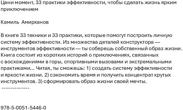 Цени момент. 33 практики эффективности, чтобы сделать жизнь ярким приключениемВ данный момент этот товар отсутствует в продаже. Возможно, у нас найдется аналогичный или похожий товар здесь. В книге 33 техники и 33 практики, которые помогут построить личную систему эффективности. Из множества деталей конструктора — инструментов эффективности — ты соберешь собственный образ жизни. Книга состоит из коротких историй о приключениях, связанных с восхождениями в горы, спортивными вызовами и экстремальными практиками... |