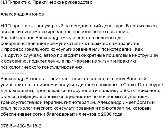 НЛП-практик. Практическое руководствоВ данный момент этот товар отсутствует в продаже. Возможно, у нас найдется аналогичный или похожий товар здесь. НЛП-практик — популярный на сегодняшний день курс. В ваших руках авторски систематизированное пособие по его освоению. Разработанное Александром руководство полезно для совершенствования коммуникативных навыков, саморазвития и профессионального консультирования или психотерапии. Как и в других случаях, автор приводит конкретные пошаговые инструкции к освоению, подкрепленные примерами из жизни и практики психологического консультирования. |