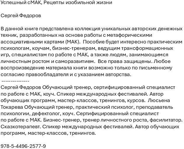 Успешный сМАК. Рецепты изобильной жизниЛюсьена Токарева, Сергей Федоров В данный момент этот товар отсутствует в продаже. Возможно, у нас найдется аналогичный или похожий товар здесь. В данной книге представлена коллекция уникальных авторских денежных техник, разработанных на основе работы с метафорическими ассоциативными картами (МАК). |