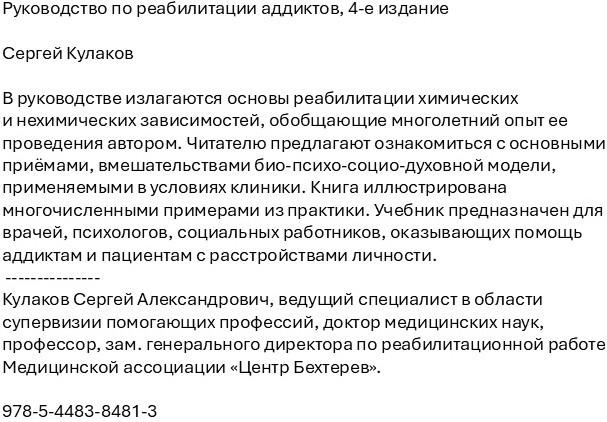 Руководство по реабилитации аддиктов. 4 изданиеВ данный момент этот товар отсутствует в продаже. Возможно, у нас найдется аналогичный или похожий товар здесь. В руководстве излагаются основы реабилитации химических и нехимических зависимостей, обобщающие многолетний опыт ее проведения автором. Читателю предлагают ознакомиться с основными приёмами, вмешательствами био-психо-социо-духовной модели, применяемыми в условиях клиники. Книга иллюстрирована многочисленными примерами из практики. Учебник предназначен для врачей, психологов, социальных работников, оказывающих помощь аддиктам и пациентам с расстройствами личности. |