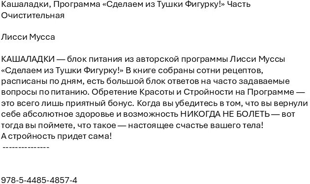Кашаладки. Программа «Сделаем из Тушки Фигурку!» Часть ОчистительнаяВ данный момент этот товар отсутствует в продаже. Возможно, у нас найдется аналогичный или похожий товар здесь. Кашаладки — блок питания из авторской программы Лисси Муссы «Сделаем из Тушки Фигурку!» В книге собраны сотни рецептов, расписаны по дням, есть большой блок ответов на часто задаваемые вопросы по питанию. Обретение Красоты и Стройности на Программе — это всего лишь приятный бонус. Когда вы убедитесь в том, что вы вернули себе абсолютное здоровье и возможность НИКОГДА НЕ БОЛЕТЬ — вот тогда вы поймете, что такое — настоящее счастье вашего тела! А стройность придет сама! |