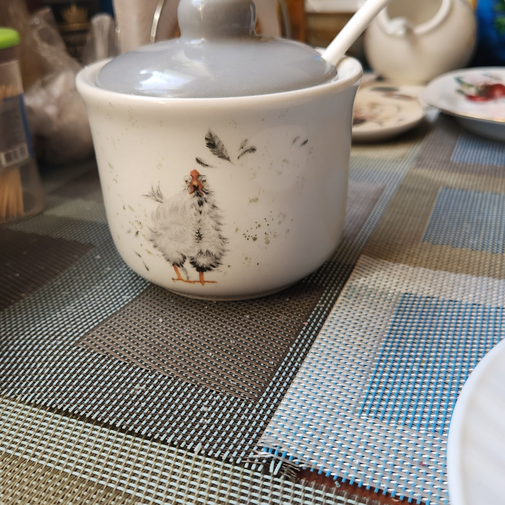 Прикольная сахарница,не очень большая,ложечка в комплекте,все целое,упаковка супер отдельное спасибо за сборку товара