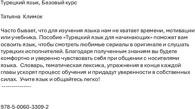Турецкий язык. Базовый курсВ данный момент этот товар отсутствует в продаже. Возможно, у нас найдется аналогичный или похожий товар здесь. Часто бывает, что для изучения языка нам не хватает времени, мотивации или учебника. Пособие «Турецкий язык для начинающих» поможет вам освоить язык, чтобы смотреть любимые сериалы в оригинале и слушать турецких исполнителей. Благодаря полученным знаниям вы будете комфортно и уверенно чувствовать себя при общении с носителями языка. Словарь, тематическая лексика, упражнения в конце каждой главы ускорят процесс обучения и придадут уверенности в собственных силах. Учите язык и общайтесь легко! |