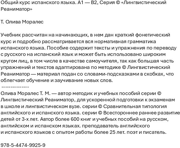 | Татьяна Олива Моралес — автор методик и учебных пособий серии Лингвистический Реаниматор, для ускоренной подготовки к экзаменам в школе и лингвистическом вузе; серии Всестороннее раннее развитие детей от 3-х лет. Автор более 200 книг и учебных пособий на русском, английском и испанском языках; преподаватель английского и испанского языков c опытом работы более 25 лет; поэт и писатель. |