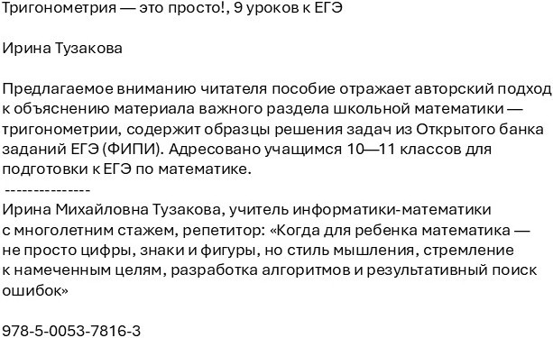 Тригонометрия — это просто! 9 уроков к ЕГЭВ данный момент этот товар отсутствует в продаже. Возможно, у нас найдется аналогичный или похожий товар здесь. Предлагаемое вниманию читателя пособие отражает авторский подход к объяснению материала важного раздела школьной математики — тригонометрии, содержит образцы решения задач из Открытого банка заданий ЕГЭ (ФИПИ). Адресовано учащимся 10–11 классов для подготовки к ЕГЭ по математике. |