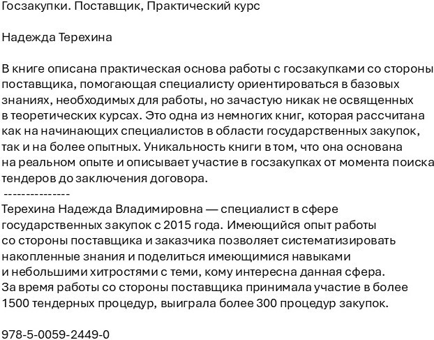 Госзакупки. Поставщик. Практический курсВ данный момент этот товар отсутствует в продаже. Возможно, у нас найдется аналогичный или похожий товар здесь. В книге описана практическая основа работы с госзакупками со стороны поставщика, помогающая специалисту ориентироваться в базовых знаниях, необходимых для работы, но зачастую никак не освященных в теоретических курсах. Это одна из немногих книг, которая рассчитана как на начинающих специалистов в области государственных закупок, так и на более опытных. Уникальность книги в том, что она основана на реальном опыте и описывает участие в госзакупках от момента поиска тендеров до заключения договора. |