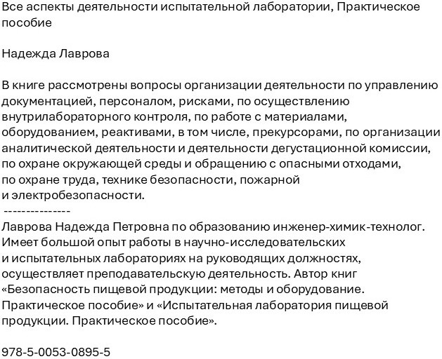Все аспекты деятельности испытательной лаборатории. Практическое пособиеВ данный момент этот товар отсутствует в продаже. Возможно, у нас найдется аналогичный или похожий товар здесь. В книге рассмотрены вопросы организации деятельности по управлению документацией, персоналом, рисками, по осуществлению внутрилабораторного контроля, по работе с материалами, оборудованием, реактивами, в том числе, прекурсорами, по организации аналитической деятельности и деятельности дегустационной комиссии, по охране окружающей среды и обращению с опасными отходами, по охране труда, технике безопасности, пожарной и электробезопасности. |