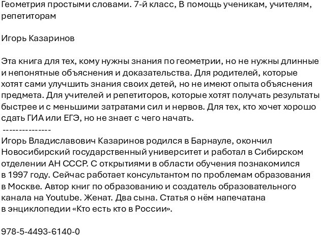 Основы школьной геометрии простыми словамиВ данный момент этот товар отсутствует в продаже. Возможно, у нас найдется аналогичный или похожий товар здесь. Эта книга для тех, кому нужны знания по геометрии, но не нужны длинные и непонятные объяснения и доказательства. Для родителей, которые хотят сами улучшить знания своих детей, но не имеют опыта объяснения предмета. Для учителей и репетиторов, которые хотят получать результаты быстрее и с меньшими затратами сил и нервов. Для тех, кто хочет хорошо сдать ГИА или ЕГЭ, но не знает с чего начать. |