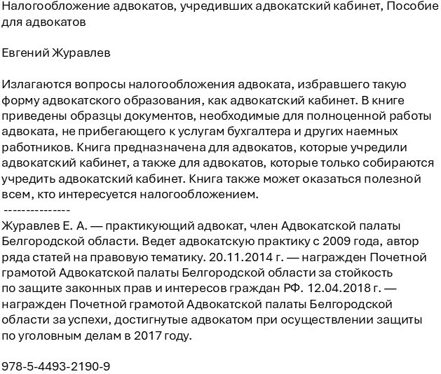Налогообложение адвокатов, учредивших адвокатский кабинет. Пособие для адвокатовВ данный момент этот товар отсутствует в продаже. Возможно, у нас найдется аналогичный или похожий товар здесь. Излагаются вопросы налогообложения адвоката, избравшего такую форму адвокатского образования, как адвокатский кабинет. В книге приведены образцы документов, необходимые для полноценной работы адвоката, не прибегающего к услугам бухгалтера и других наемных работников. Книга предназначена для адвокатов, которые учредили адвокатский кабинет, а также для адвокатов, которые только собираются учредить адвокатский кабинет. Книга также может оказаться полезной всем, кто интересуется налогообложением. |
