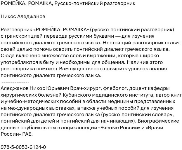 РОМЕЙКА. РΩМАIIКА. Русско-понтийский разговорникВ данный момент этот товар отсутствует в продаже. Возможно, у нас найдется аналогичный или похожий товар здесь. Разговорник «ΡОΜΕЙΚΑ. РΩМАΙΙКА» (русско-понтийский разговорник) с транскрипцией перевода русскими буквами — для изучения понтийского диалекта греческого языка. Настоящий разговорник ставит своей целью помочь освоить понтийский диалект греческого языка. Сюда включено множество слов и выражений, которые широко употребляются в быту и необходимы для общения. Наличие этого разговорника поможет Вам существенно повысить уровень знания понтийского диалекта греческого языка. |