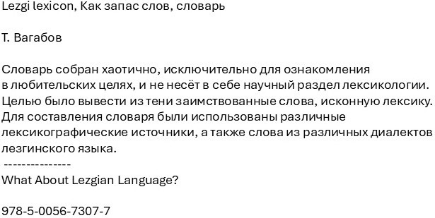 Lezgi lexicon. Как запас слов, словарьВ данный момент этот товар отсутствует в продаже. Возможно, у нас найдется аналогичный или похожий товар здесь. Словарь собран хаотично, исключительно для ознакомления в любительских целях, и не несёт в себе научный раздел лексикологии. Целью было вывести из тени заимствованные слова, исконную лексику. Для составления словаря были использованы различные лексикографические источники, а также слова из различных диалектов лезгинского языка. |