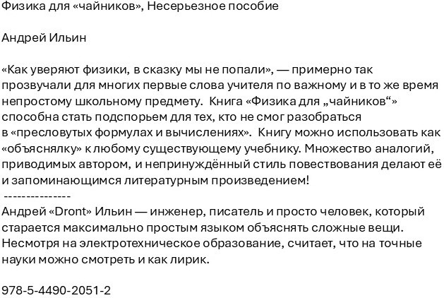 Физика для «чайников». Несерьезное пособиеВ данный момент этот товар отсутствует в продаже. Возможно, у нас найдется аналогичный или похожий товар здесь. «Как уверяют физики, в сказку мы не попали», — примерно так прозвучали для многих первые слова учителя по важному и в то же время непростому школьному предмету. Книга «Физика для чайников» способна стать подспорьем для тех, кто не смог разобраться в «пресловутых формулах и вычислениях». Книгу можно использовать как «объяснялку» к любому существующему учебнику. Множество аналогий, приводимых автором, и непринуждённый стиль повествования делают её и запоминающимся литературным произведением! |