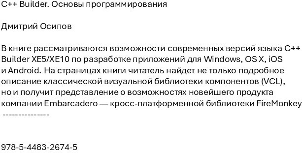 C++ Builder. Основы программированияВ данный момент этот товар отсутствует в продаже. Возможно, у нас найдется аналогичный или похожий товар здесь. В книге рассматриваются возможности современных версий языка C++ Builder XE5/XE10 по разработке приложений для Windows, OS X, iOS и Android. На страницах книги читатель найдет не только подробное описание классической визуальной библиотеки компонентов (VCL), но и получит представление о возможностях новейшего продукта компании Embarcadero — кросс-платформенной библиотеки FireMonkey. |