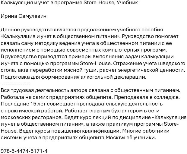 Калькуляция и учет в программе Store-House. УчебникВ данный момент этот товар отсутствует в продаже. Возможно, у нас найдется аналогичный или похожий товар здесь. Данное руководство является продолжением учебного пособия «Калькуляция и учет в общественном питании». Руководство помогает связать саму методику ведения учета в общественном питании с ее исполнением с помощью современных компьютерных программ. В руководстве приводятся примеры выполнения задач калькуляции и учета с помощью программы Store-House. Отражение учета шведского стола, акта переработки мясной туши, расчет энергетической ценности. Подготовка для формирования алкогольной декларации. |