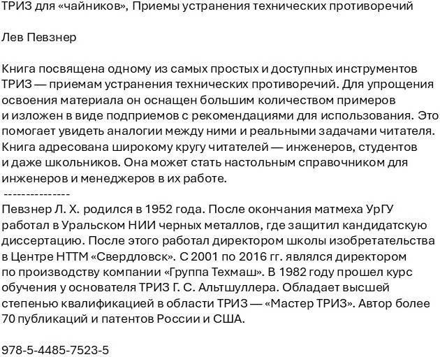 ТРИЗ для «чайников». Приемы устранения технических противоречийВ данный момент этот товар отсутствует в продаже. Возможно, у нас найдется аналогичный или похожий товар здесь. В книге материал изложен в виде подприёмов с рекомендациями для использования. Для упрощения освоения он оснащён большим количеством примеров. Это помогает увидеть аналогии между подприёмами и реальными задачами читателя. |