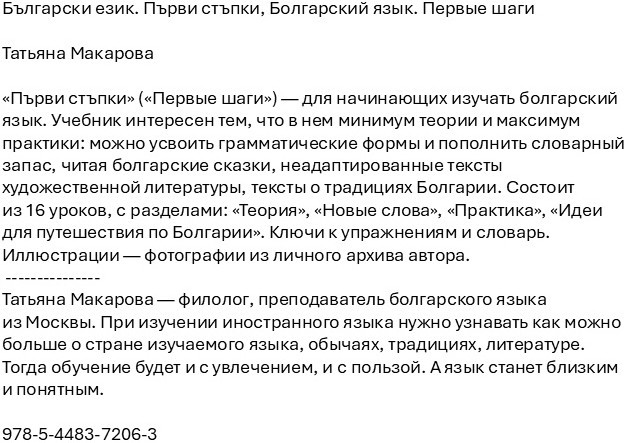 Български език. Първи стъпки, Болгарский язык. Первые шагиВ данный момент этот товар отсутствует в продаже. Возможно, у нас найдется аналогичный или похожий товар здесь. «Първи стъпки» («Первые шаги») — для начинающих изучать болгарский язык. Учебник интересен тем, что в нем минимум теории и максимум практики: можно усвоить грамматические формы и пополнить словарный запас, читая болгарские сказки, неадаптированные тексты художественной литературы, тексты о традициях Болгарии. Состоит из 16 уроков, с разделами: «Теория», «Новые слова», «Практика», «Идеи для путешествия по Болгарии». Ключи к упражнениям и словарь. Иллюстрации — фотографии из личного архива автора. |