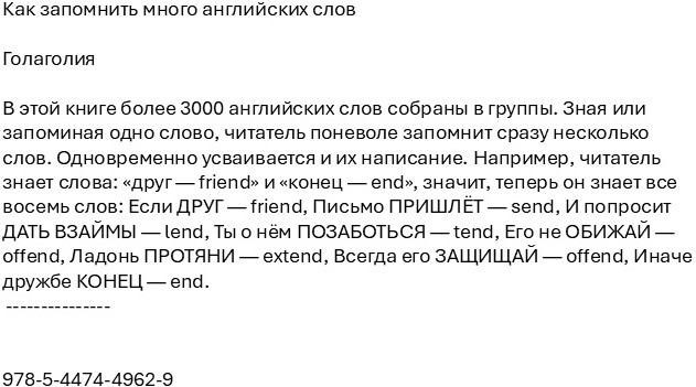 Как запомнить много английских словВ данный момент этот товар отсутствует в продаже. Возможно, у нас найдется аналогичный или похожий товар здесь. Эта книга — ценный источник информации, который поможет разобраться в важной теме и найти новые решения. В этой книге более 3000 английских слов собраны в группы. Зная или запоминая одно слово, читатель поневоле запомнит сразу несколько слов. Одновременно усваивается и их написание. |