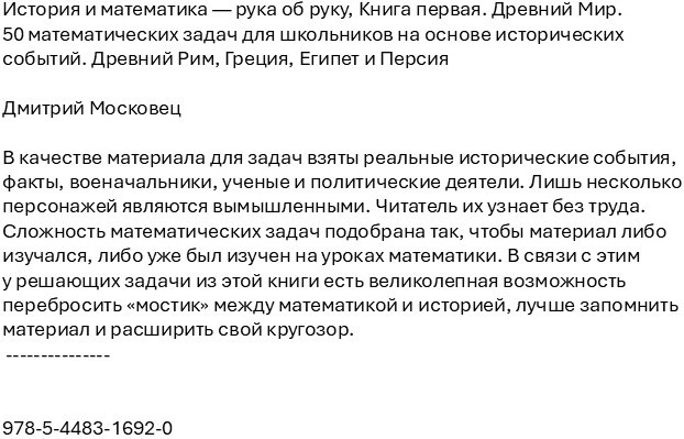 История и математика — рука об руку. Книга первая. Древний МирВ данный момент этот товар отсутствует в продаже. Возможно, у нас найдется аналогичный или похожий товар здесь. В качестве материала для задач взяты реальные исторические события, факты, военачальники, ученые и политические деятели. Лишь несколько персонажей являются вымышленными. Читатель их узнает без труда. Сложность математических задач подобрана так, чтобы материал либо изучался, либо уже был изучен на уроках математики. В связи с этим у решающих задачи из этой книги есть великолепная возможность перебросить «мостик» между математикой и историей, лучше запомнить материал и расширить свой кругозор. |