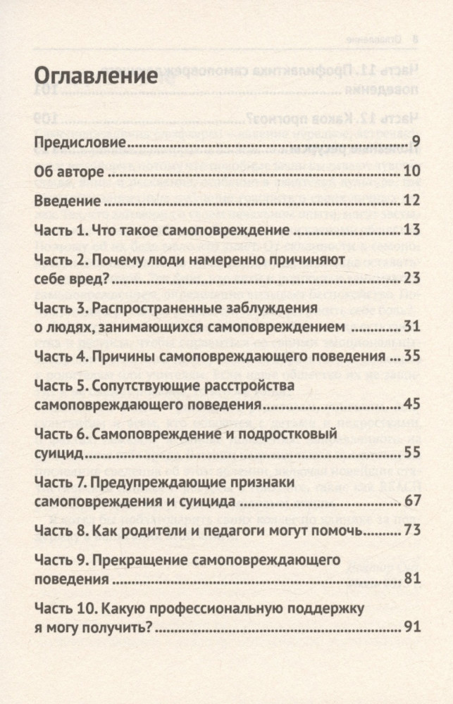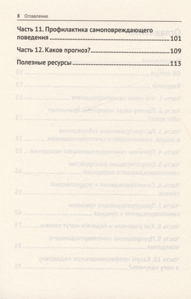 У молодых людей не всегда есть средства и ресурсы, чтобы справиться со своими эмоциональными проблемами. Многие не решаются обратиться за помощью к родителям или учителям. Книга подскажет, как вовремя заметить, что ребенок прибегает к самоповреждениям, и научить его адекватным образом контролировать свои эмоции и грамотно снимать стресс, не проявляя аутоагрессию.