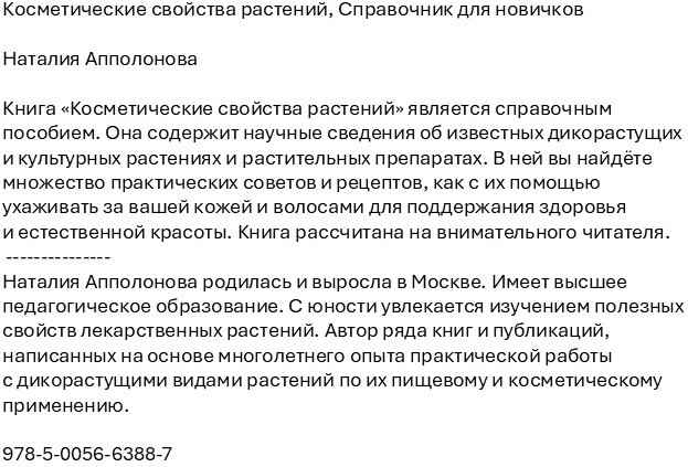 | Наталия Апполонова родилась и выросла в Москве. Имеет высшее педагогическое образование. С юности увлекается изучением полезных свойств лекарственных растений. Автор ряда книг и публикаций, написанных на основе многолетнего опыта практической работы с дикорастущими видами растений по их пищевому и косметическому применению. |