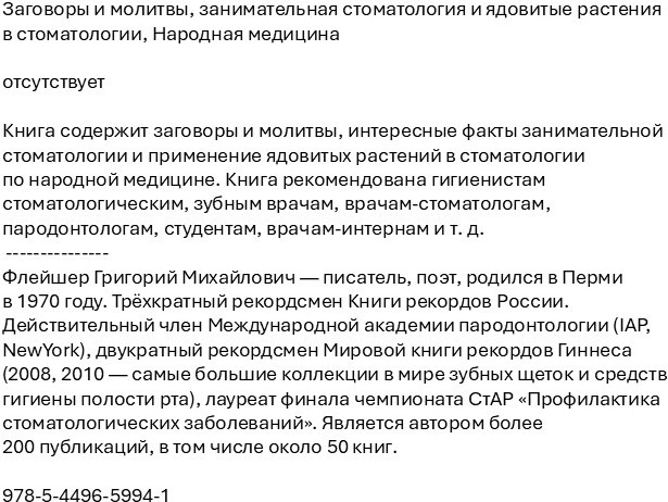 Заговоры и молитвы, занимательная стоматология и ядовитые растения в стоматологииВ данный момент этот товар отсутствует в продаже. Возможно, у нас найдется аналогичный или похожий товар здесь. Книга содержит заговоры и молитвы, интересные факты занимательной стоматологии и применение ядовитых растений в стоматологии по народной медицине. Книга рекомендована гигиенистам стоматологическим, зубным врачам, врачам-стоматологам, пародонтологам, студентам, врачам-интернам и т. д. |