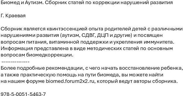Биомед и Аутизм. Сборник статей по коррекции нарушений развитияВ данный момент этот товар отсутствует в продаже. Возможно, у нас найдется аналогичный или похожий товар здесь. Сборник является квинтэссенцией опыта родителей детей с различными нарушениями развития (аутизм, СДВГ, ДЦП и другие) и посвящен вопросам питания, витаминной поддержки и укрепления иммунитета. Информация представлена в виде методических статей по основным вопросам биомедкоррекции. |