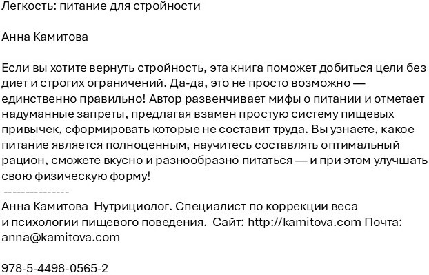 Легкость питание для стройностиВ данный момент этот товар отсутствует в продаже. Возможно, у нас найдется аналогичный или похожий товар здесь. Если вы хотите вернуть стройность, эта книга поможет добиться цели без диет и строгих ограничений. Да-да, это не просто возможно — единственно правильно! Автор развенчивает мифы о питании и отметает надуманные запреты, предлагая взамен простую систему пищевых привычек, сформировать которые не составит труда. Вы узнаете, какое питание является полноценным, научитесь составлять оптимальный рацион, сможете вкусно и разнообразно питаться — и при этом улучшать свою физическую форму! |