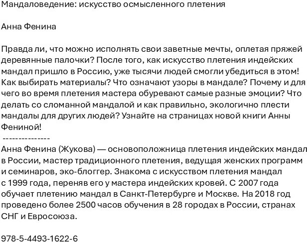 Мандаловедение: искусство осмысленного плетенияВ данный момент этот товар отсутствует в продаже. Возможно, у нас найдется аналогичный или похожий товар здесь. Правда ли, что можно исполнять свои заветные мечты, оплетая пряжей деревянные палочки? После того, как искусство плетения индейских мандал пришло в Россию, уже тысячи людей смогли убедиться в этом! Как выбирать материалы? Что означают узоры в мандале? Почему и для чего во время плетения мастера обуревают самые разные эмоции? Что делать со сломанной мандалой и как правильно, экологично плести мандалы для других людей? Узнайте на страницах новой книги Анны Фениной! |