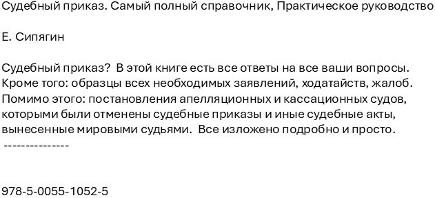 Судебный приказ. Самый полный справочникВ данный момент этот товар отсутствует в продаже. Возможно, у нас найдется аналогичный или похожий товар здесь. Судебный приказ? В этой книге есть все ответы на все ваши вопросы. Кроме того: образцы всех необходимых заявлений, ходатайств, жалоб. Помимо этого: постановления апелляционных и кассационных судов, которыми были отменены судебные приказы и иные судебные акты, вынесенные мировыми судьями. Все изложено подробно и просто. |