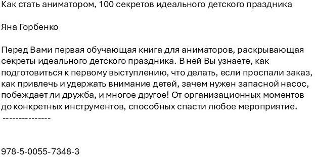 Как стать аниматоромВ данный момент этот товар отсутствует в продаже. Возможно, у нас найдется аналогичный или похожий товар здесь. Перед Вами первая обучающая книга для аниматоров, раскрывающая секреты идеального детского праздника. В ней Вы узнаете, как подготовиться к первому выступлению, что делать, если проспали заказ, как привлечь и удержать внимание детей, зачем нужен запасной насос, побеждает ли дружба, и многое другое! От организационных моментов до конкретных инструментов, способных спасти любое мероприятие. |