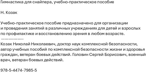 Гимнастика для снайпераНиколай Николаевич Козак, Сергей Борисович Головин В данный момент этот товар отсутствует в продаже. Возможно, у нас найдется аналогичный или похожий товар здесь. Учебно-практическое пособие предназначено для организации и проведения занятий в различных учреждениях для детей и взрослых по профилактике и восстановлению зрения в любом возрасте. |