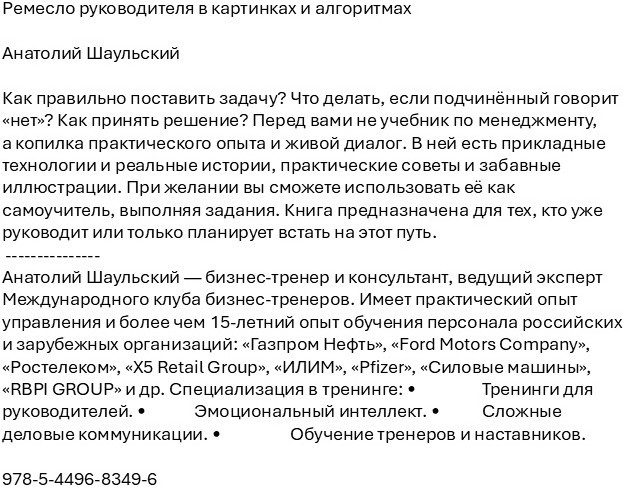 Ремесло руководителя в картинках и алгоритмахВ данный момент этот товар отсутствует в продаже. Возможно, у нас найдется аналогичный или похожий товар здесь. Как правильно поставить задачу? Что делать, если подчинённый говорит «нет»? Как принять решение? Перед вами не учебник по менеджменту, а копилка практического опыта и живой диалог. В ней есть прикладные технологии и реальные истории, практические советы и забавные иллюстрации. При желании вы сможете использовать её как самоучитель, выполняя задания. Книга предназначена для тех, кто уже руководит или только планирует встать на этот путь. |