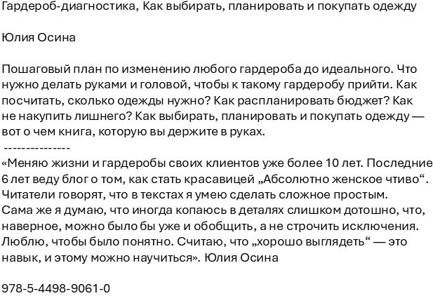 Гардероб-диагностикаВ данный момент этот товар отсутствует в продаже. Возможно, у нас найдется аналогичный или похожий товар здесь. Пошаговый план по изменению любого гардероба до идеального. Что нужно делать руками и головой, чтобы к такому гардеробу прийти. Как посчитать, сколько одежды нужно? Как распланировать бюджет? Как не накупить лишнего? Как выбирать, планировать и покупать одежду — вот о чем книга, которую вы держите в руках. |