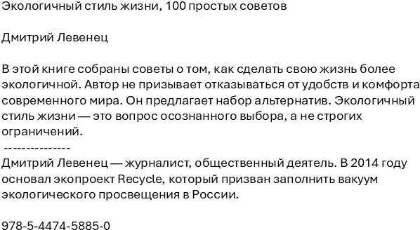 Экологичный стиль жизни. 100 простых советовВ данный момент этот товар отсутствует в продаже. Возможно, у нас найдется аналогичный или похожий товар здесь. В этой книге собраны советы о том, как сделать свою жизнь более экологичной. Автор не призывает отказываться от удобств и комфорта современного мира. Он предлагает набор альтернатив. Экологичный стиль жизни — это вопрос осознанного выбора, а не строгих ограничений. |