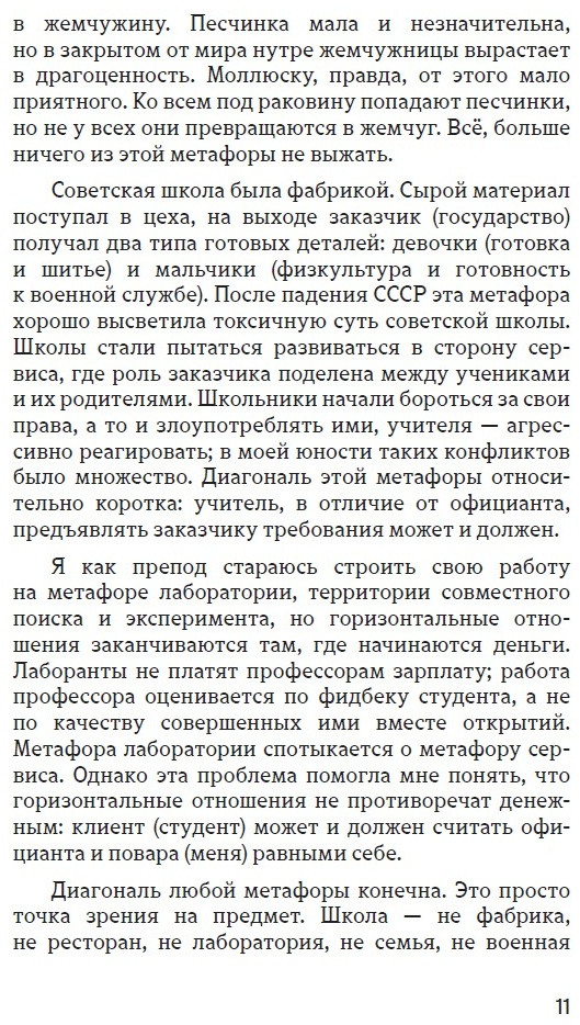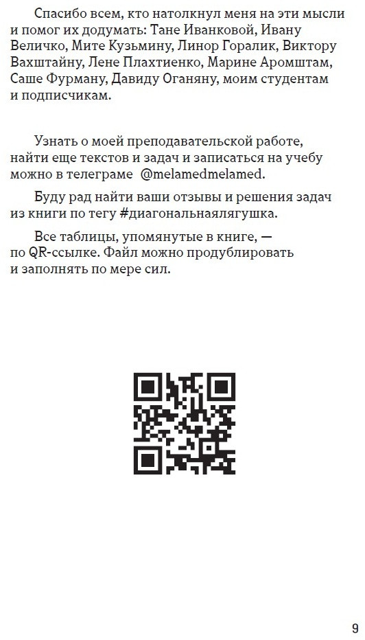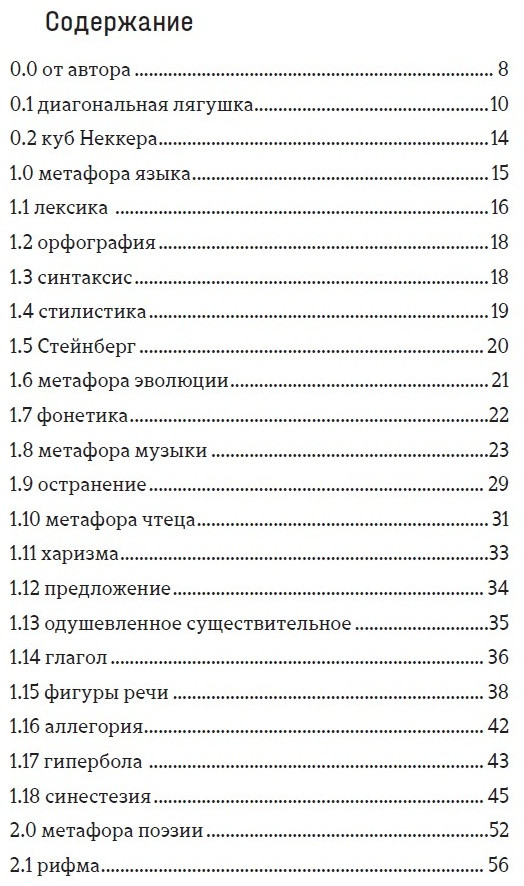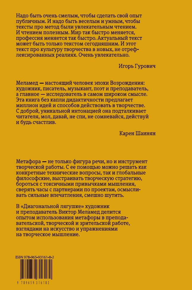 Диагональная лягушкаВ данный момент этот товар отсутствует в продаже. Возможно, у нас найдется аналогичный или похожий товар здесь. В книге «Диагональная лягушка» художник, преподаватель, писатель и музыкант Виктор Меламед делится опытом использования метафоры в преподавательской, творческой и зрительской работе, взглядами на искусство и упражнениями на творческое мышление. Что все-таки общего есть у столь разных направлений человеческой деятельности, как литература, музыка, изобразительное искусство? Вероятно, стремление взять некий факт бытия либо сознания, доступный чувственно или интеллектуально, чтобы сообщить о нем, несколько переврав, но через это перевирание чем-то дополнив — если, конечно, произведение удалось. Проще говоря, самые разные виды искусства могут жить параллельно, но их всегда будет роднить один инструмент — метафора. Так, по крайней мере, считает художник, музыкант, а с недавних пор еще и практикующий прозаик Виктор Меламед. Образ диагональной лягушки автор одолжил у пионера и ветерана цифрового искусства Кая Краузе, заметившего: «Хорошая аналогия подобна диагональной лягушке». Отталкиваясь от этого образа, Меламед выстраивает своего рода трактат (или антитрактат, это с какого угла зрения) о, как легко догадаться, метафоре в искусстве. |