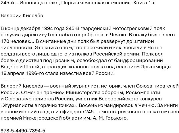 245-й… Исповедь полка. Первая чеченская кампания. Книга 1-яВ данный момент этот товар отсутствует в продаже. Возможно, у нас найдется аналогичный или похожий товар здесь. В конце декабря 1994 года 245-й гвардейский мотострелковый полк получил директиву Генштаба о переброске в Чечню. В полку было всего 170 человек… В считанные дни полк был развернут до штатной численности. Эта книга о том, что пережили и как воевали в Чечне солдаты всего лишь одного из полков Российской армии. Полк вел боевые действия под Грозным, освобождал от бандформирований Ведено и Шатой, а трагедия колонны полка под селением Ярышмарды 16 апреля 1996-го стала известна всей России. |