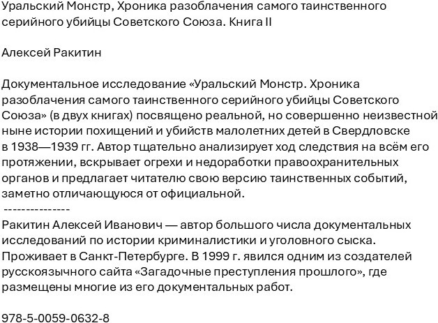 Уральский Монстр. Хроника разоблачения самого таинственного серийного убийцы Советского Союза. Книга IIВ данный момент этот товар отсутствует в продаже. Возможно, у нас найдется аналогичный или похожий товар здесь. Документальное исследование «Уральский Монстр. Хроника разоблачения самого таинственного серийного убийцы Советского Союза» (в двух книгах) посвящено реальной, но совершенно неизвестной ныне истории похищений и убийств малолетних детей в Свердловске в 1938-1939 гг. Автор тщательно анализирует ход следствия на всём его протяжении, вскрывает огрехи и недоработки правоохранительных органов и предлагает читателю свою версию таинственных событий, заметно отличающуюся от официальной. |