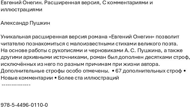 Евгений Онегин. Расширенная версия с комментариями и иллюстрациямиВ данный момент этот товар отсутствует в продаже. Возможно, у нас найдется аналогичный или похожий товар здесь. Уникальная расширенная версия романа «Евгений Онегин» позволит читателю познакомиться с малоизвестными стихами великого поэта. На основе работы с рукописями и черновиками А. С. Пушкина, а также другими архивными источниками, роман был дополнен десятками строф, исключённых из него по разным причинам при жизни автора. Дополнительные строфы особо отмечены. |
