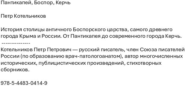Пантикапей, Боспор, КерчьВ данный момент этот товар отсутствует в продаже. Возможно, у нас найдется аналогичный или похожий товар здесь. История столицы античного Боспорского царства, самого древнего города Крыма и России. От Пантикапея до современного города Керчь. |