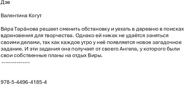 ДэвВ данный момент этот товар отсутствует в продаже. Возможно, у нас найдется аналогичный или похожий товар здесь. Ви́ра Тара́нова решает сменить обстановку и уехать в деревню в поисках вдохновения для творчества. Однако ей никак не удаётся заняться своими делами, так как каждое утро у неё появляется новое загадочное задание. И эти задания она получает от своего Ангела, у которого были свои собственные планы на отдых Виры. |