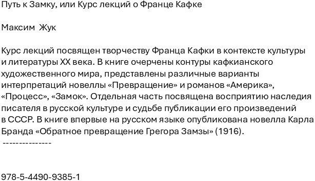 Путь к Замку, или Курс лекций о Франце КафкеВ данный момент этот товар отсутствует в продаже. Возможно, у нас найдется аналогичный или похожий товар здесь. Курс лекций посвящен творчеству Франца Кафки в контексте культуры и литературы ХХ века. В книге очерчены контуры кафкианского художественного мира, представлены различные варианты интерпретаций новеллы «Превращение» и романов «Америка», «Процесс», «Замок». Отдельная часть посвящена восприятию наследия писателя в русской культуре и судьбе публикации его произведений в СССР. В книге впервые на русском языке опубликована новелла Карла Бранда «Обратное превращение Грегора Замзы» (1916). |