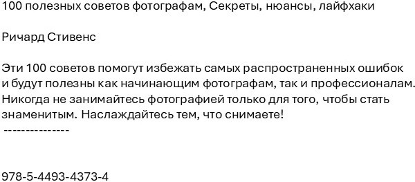 100 полезных советов фотографам. Секреты, нюансы, лайфхакиВ данный момент этот товар отсутствует в продаже. Возможно, у нас найдется аналогичный или похожий товар здесь. Эти 100 советов помогут избежать самых распространенных ошибок и будут полезны как начинающим фотографам, так и профессионалам. Никогда не занимайтесь фотографией только для того, чтобы стать знаменитым. Наслаждайтесь тем, что снимаете! |