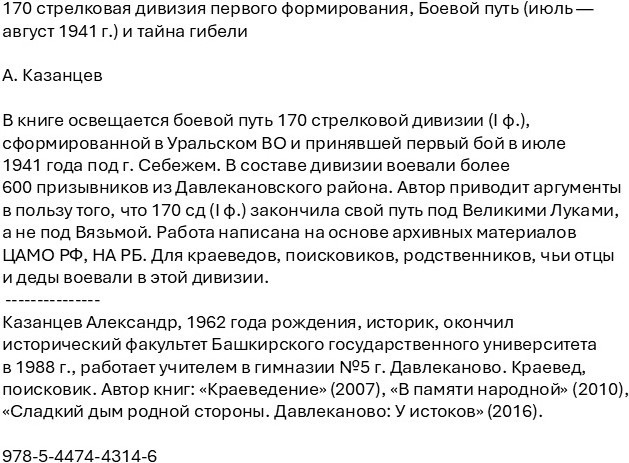 170 стрелковая дивизия первого формированияВ данный момент этот товар отсутствует в продаже. Возможно, у нас найдется аналогичный или похожий товар здесь. В книге освещается боевой путь 170 стрелковой дивизии (I ф.), сформированной в Уральском ВО и принявшей первый бой в июле 1941 года под г. Себежем. В составе дивизии воевали более 600 призывников из Давлекановского района. Автор приводит аргументы в пользутого, что 170 сд (I ф.) закончила свой путь под Великими Луками, а не под Вязьмой. Работа написана на основе архивных материалов ЦАМО РФ, НА РБ. Для краеведов, поисковиков, родственников, чьи отцы и деды воевали в этой дивизии. |