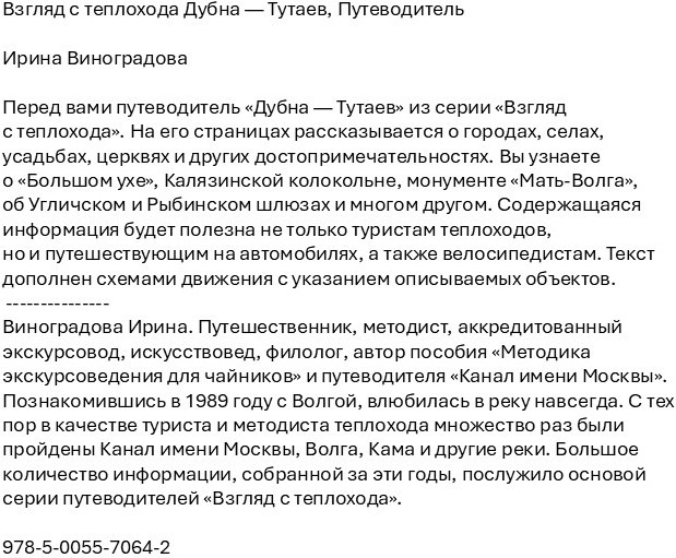 Взгляд с теплохода Дубна — Тутаев: путеводительВ данный момент этот товар отсутствует в продаже. Возможно, у нас найдется аналогичный или похожий товар здесь. Серия: Взгляд с теплохода Перед вами путеводитель «Дубна — Тутаев» из серии «Взгляд с теплохода». На его страницах рассказывается о городах, селах, усадьбах, церквях и других достопримечательностях. Вы узнаете о «Большом ухе», Калязинской колокольне, монументе «Мать-Волга», об Угличском и Рыбинском шлюзах и многом другом. Содержащаяся информация будет полезна не только туристам теплоходов, но и путешествующим на автомобилях, а также велосипедистам. Текст дополнен схемами движения с указанием описываемых объектов. |